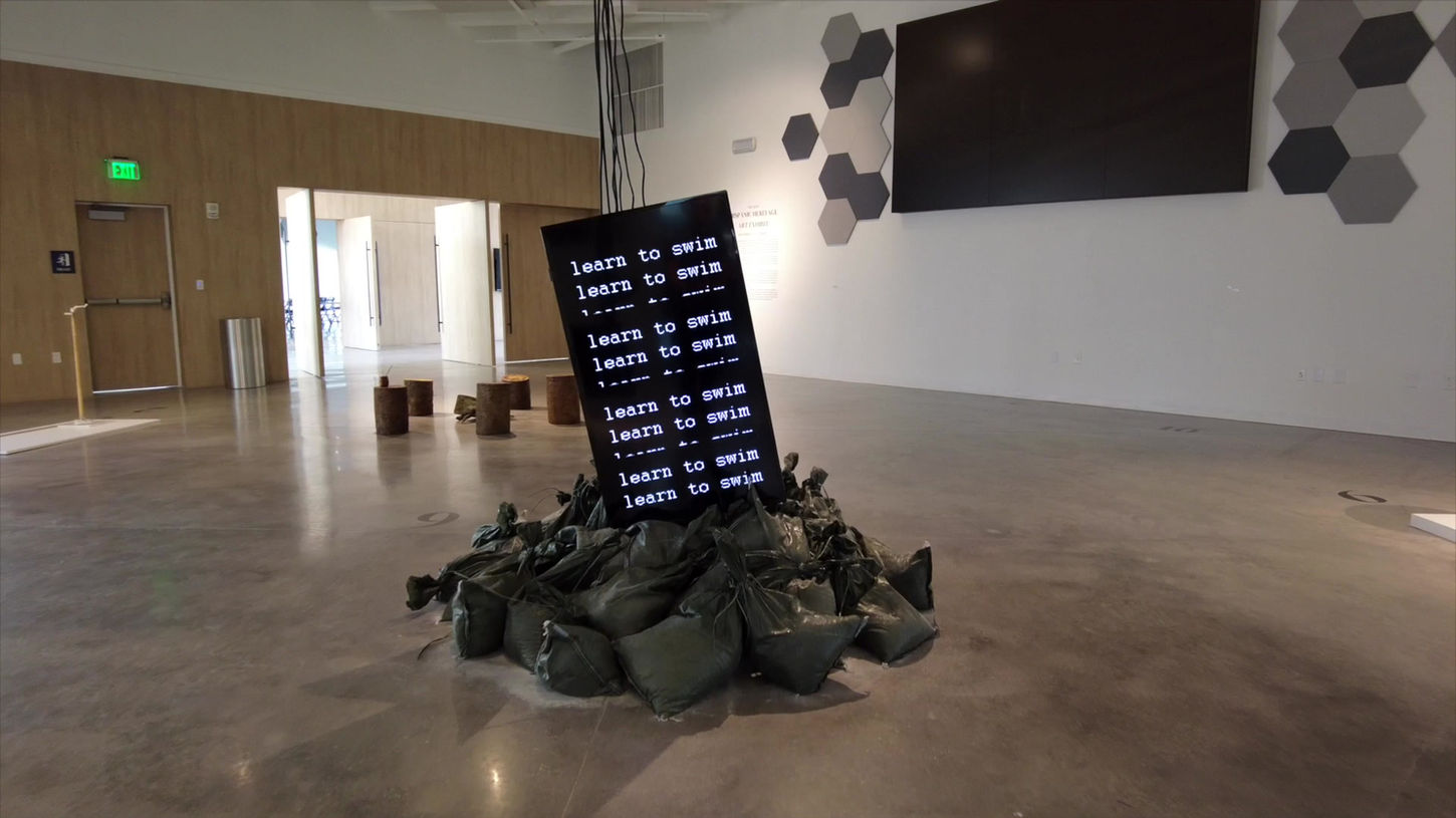 The installation consists of two facing monitors, positioned at an angle within a circle of sandbags like those commonly used to contain flooding. On both screens, the video LEARN TO SWIM is projected: a GIF in which the phrase LEARN TO SWIM repeats incessantly, evoking the hypnotic rhythm of old split-flap boards found in airports and train stations. The work alludes to the constant need for adaptation and survival in a context marked by environmental, social, and cultural uncertainty.
